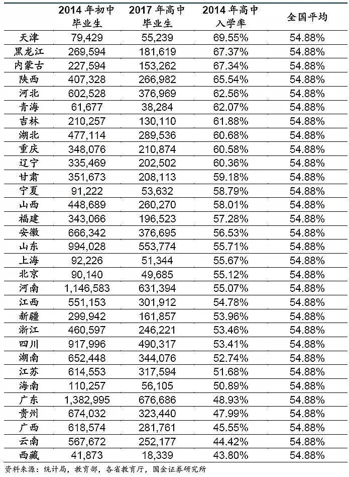 西藏,云南,广西等地高中入学率显著低于平均,很重要的原因就是当地中学建设本来也有些缺失,导致高中升学率较低。